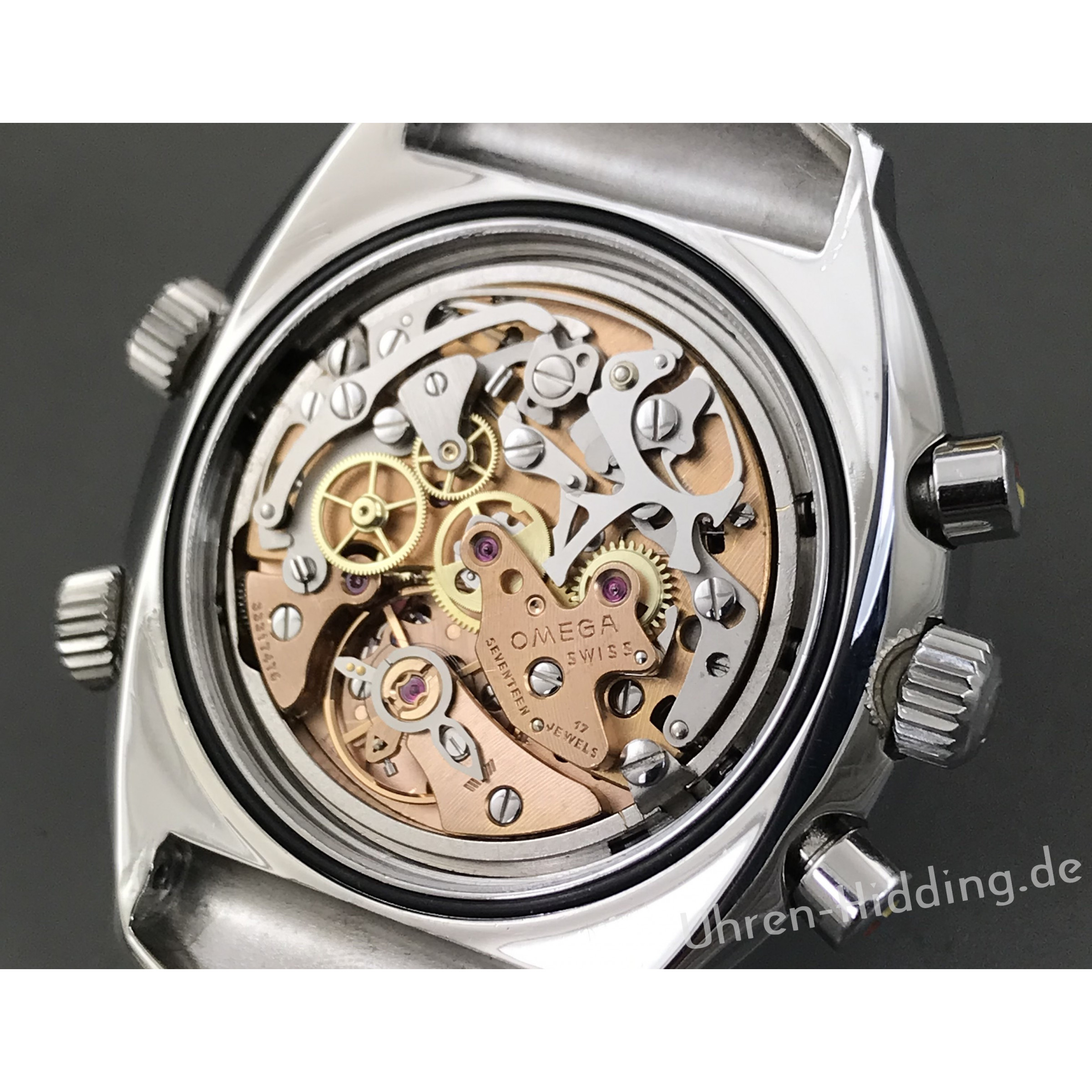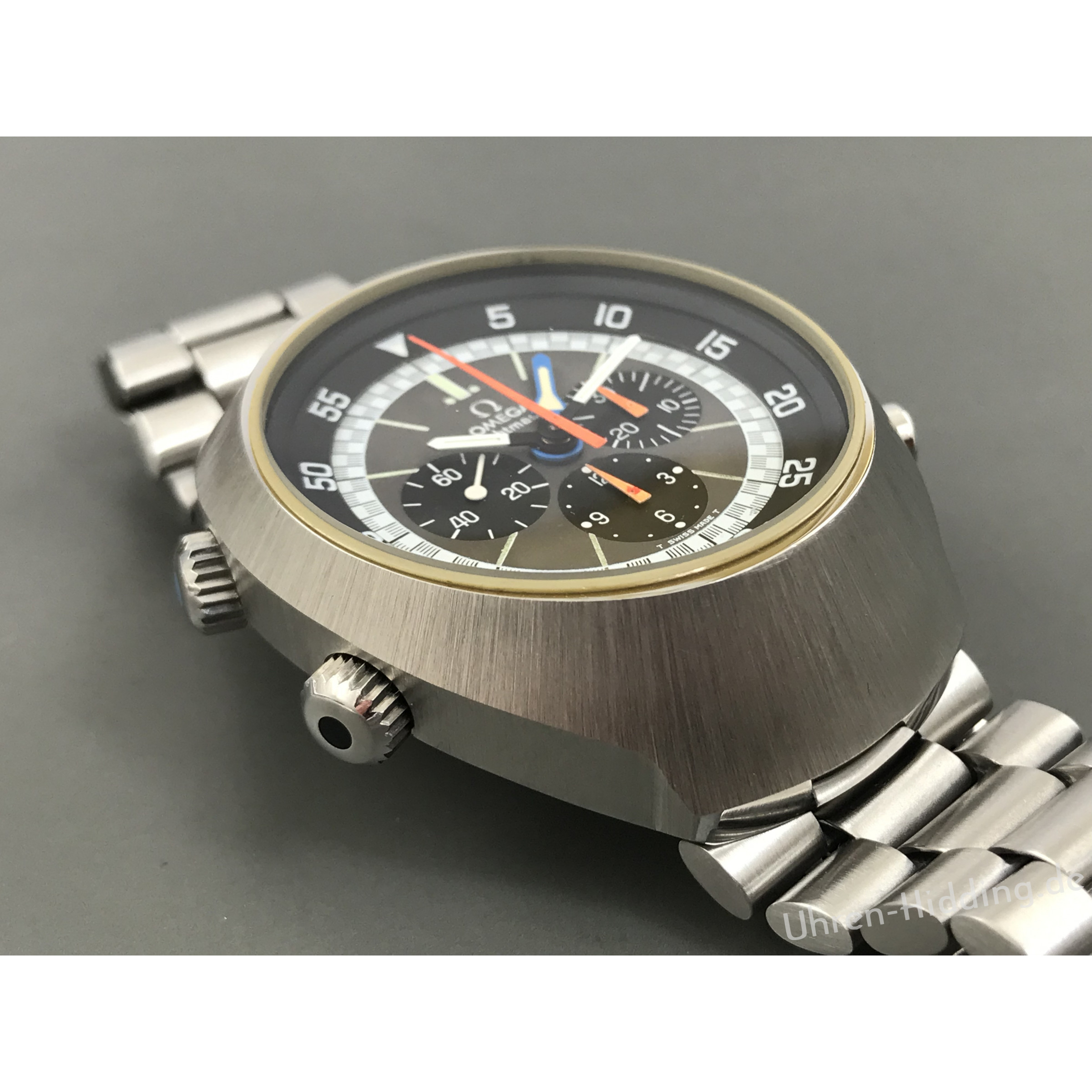 Omega FlightmasterRef. 145.036um 1971tonneauförmiges Stahlgehäuse und StahlbandWerk: rotvergoldetes Werk, Cal. 911, 17 Jewelsvierschenkelige monometallische Unruh, FlachspiraleExcenter-FeinregulierungGehäusedurchmesser: ca. 43mm