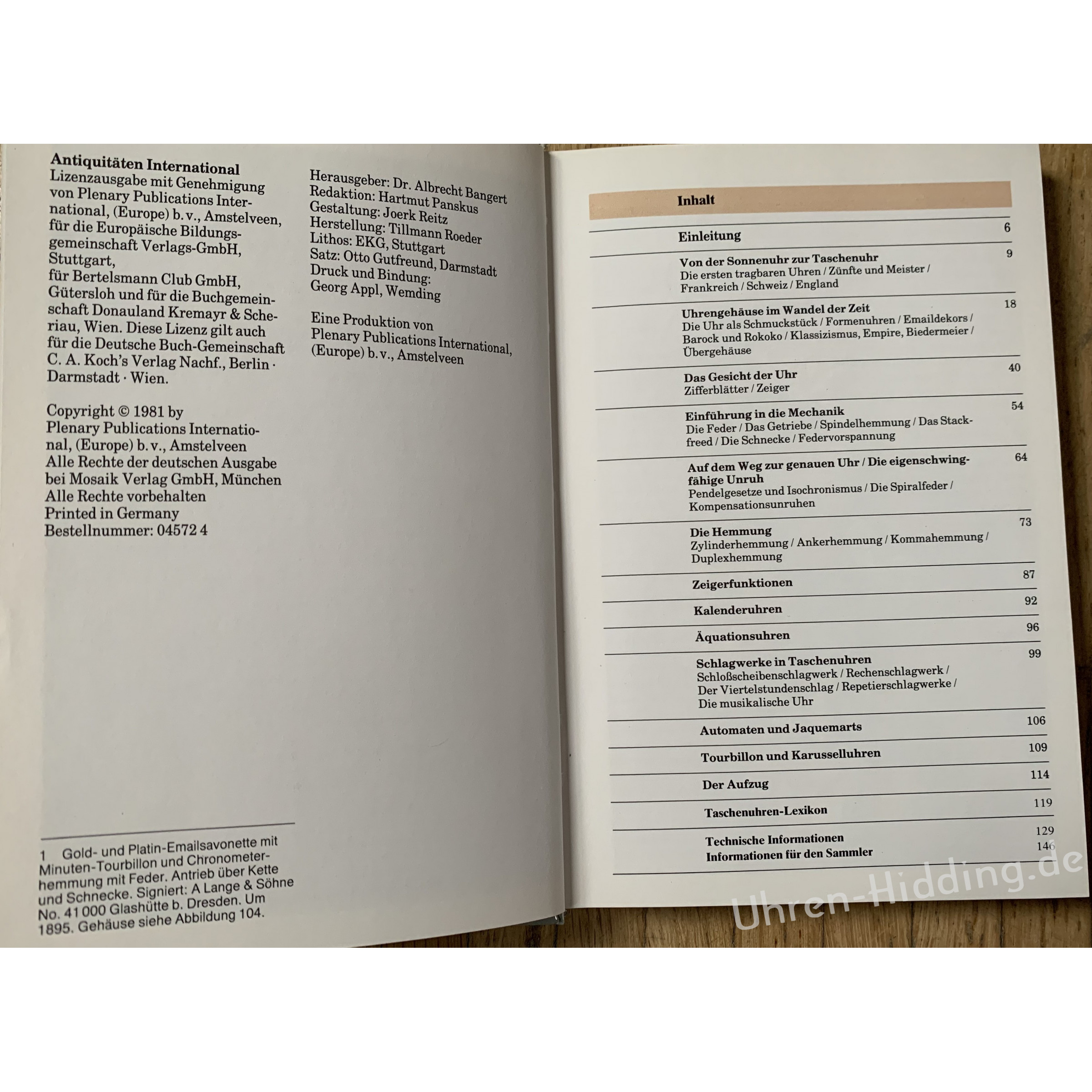 Buch „Taschenuhren“vom Nürnberger Ei zur Präzisionsuhrvon Walter SpieglEin unentbehrliches Handbuch für Laien und Anfänger1981, Mosaik Verlag Münchengebundenes BuchGesamt 160 SeitenAbmessung: ca. 13cm breit, ca. 20cm hoch