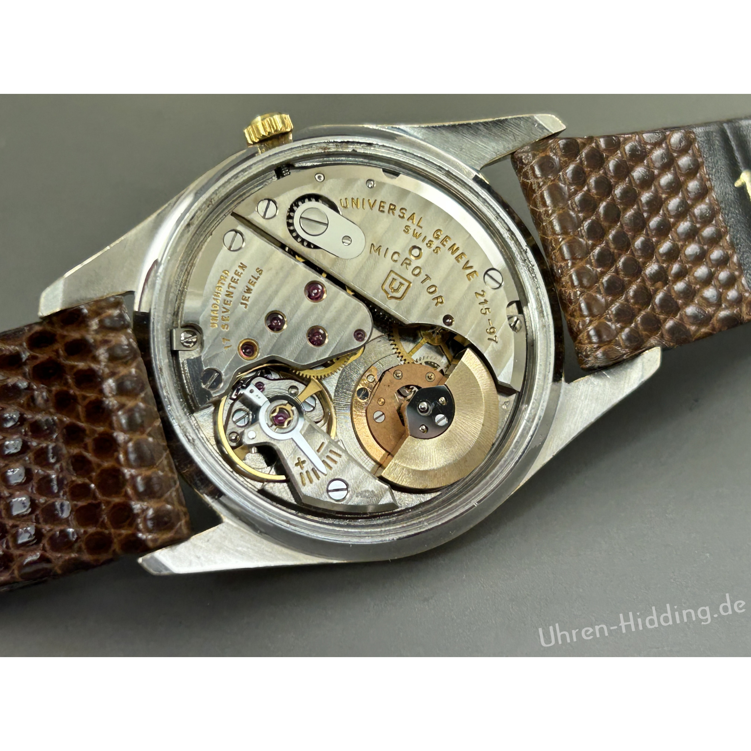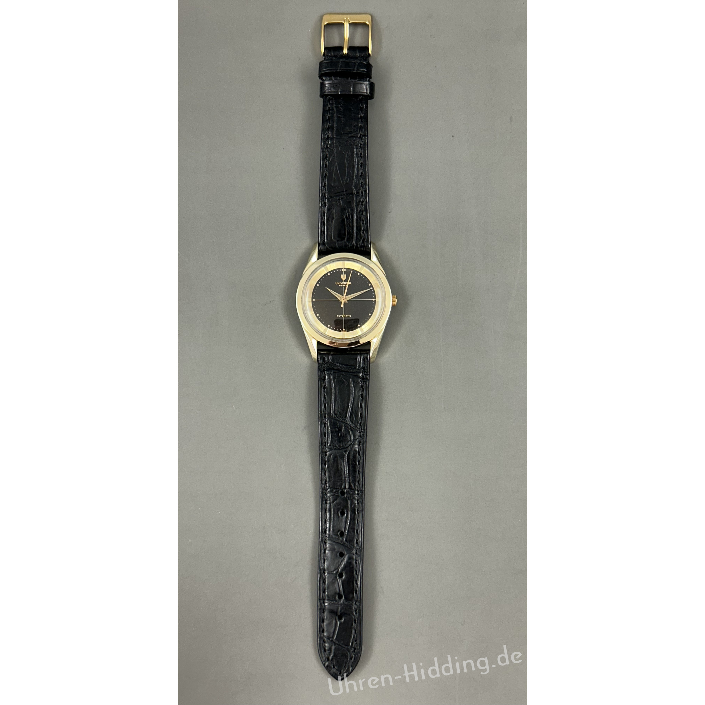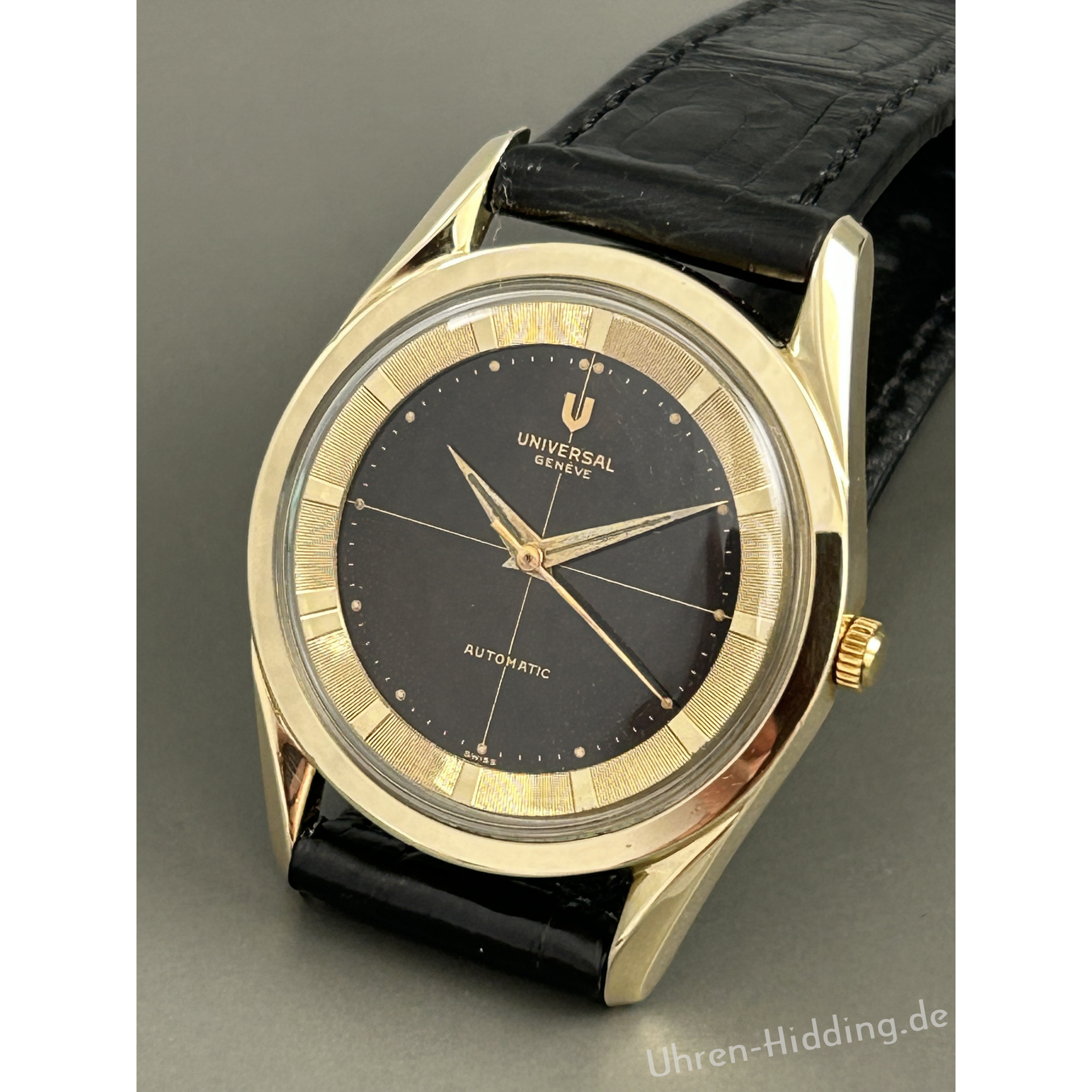 Universal GenèveAutomaticcase with gold-capblack dial with hours-indexesDauphin-form-handsMovement: Automatic, 17 JewelsDiameter of case: approx. 35mmblack kroko-leather-strap, 18mm